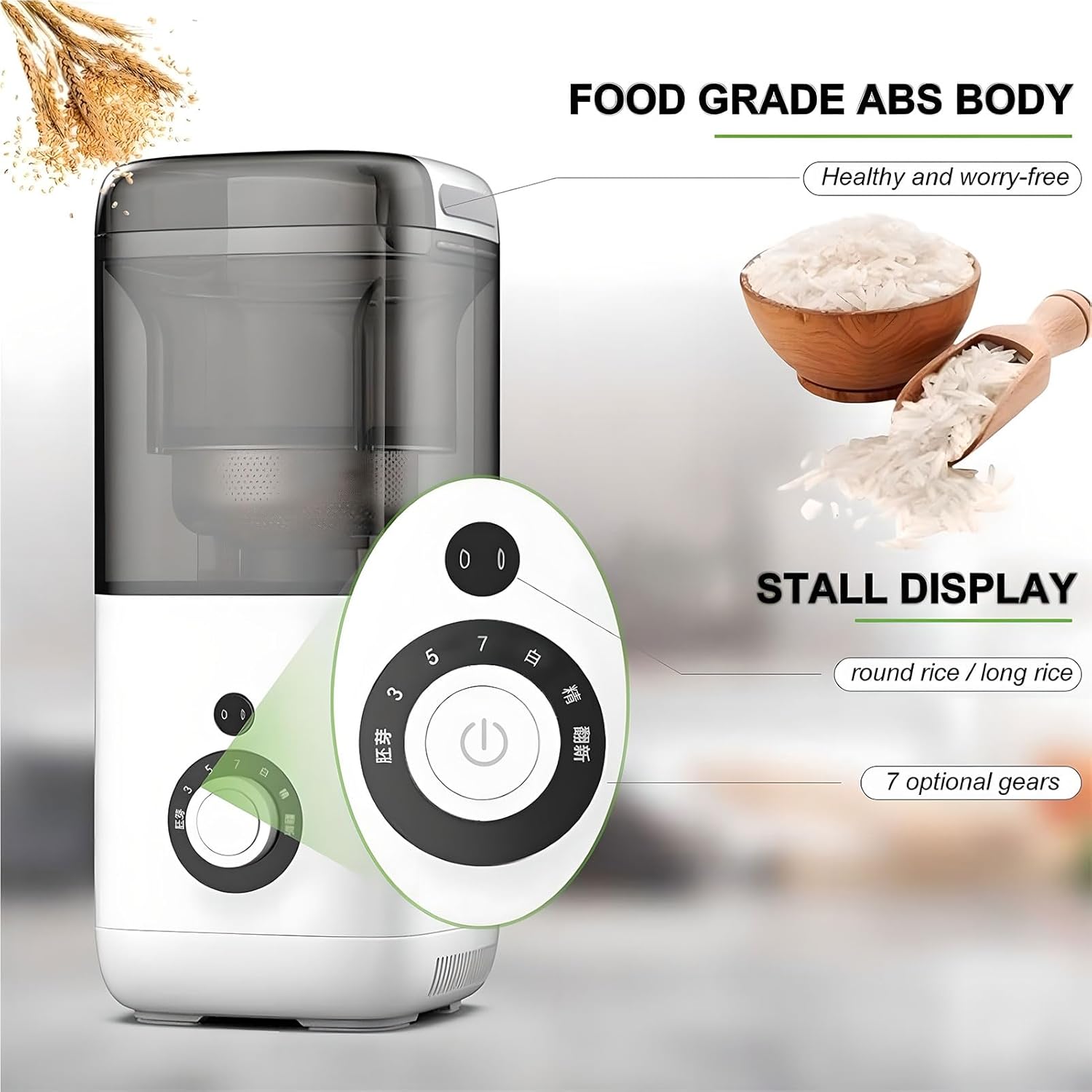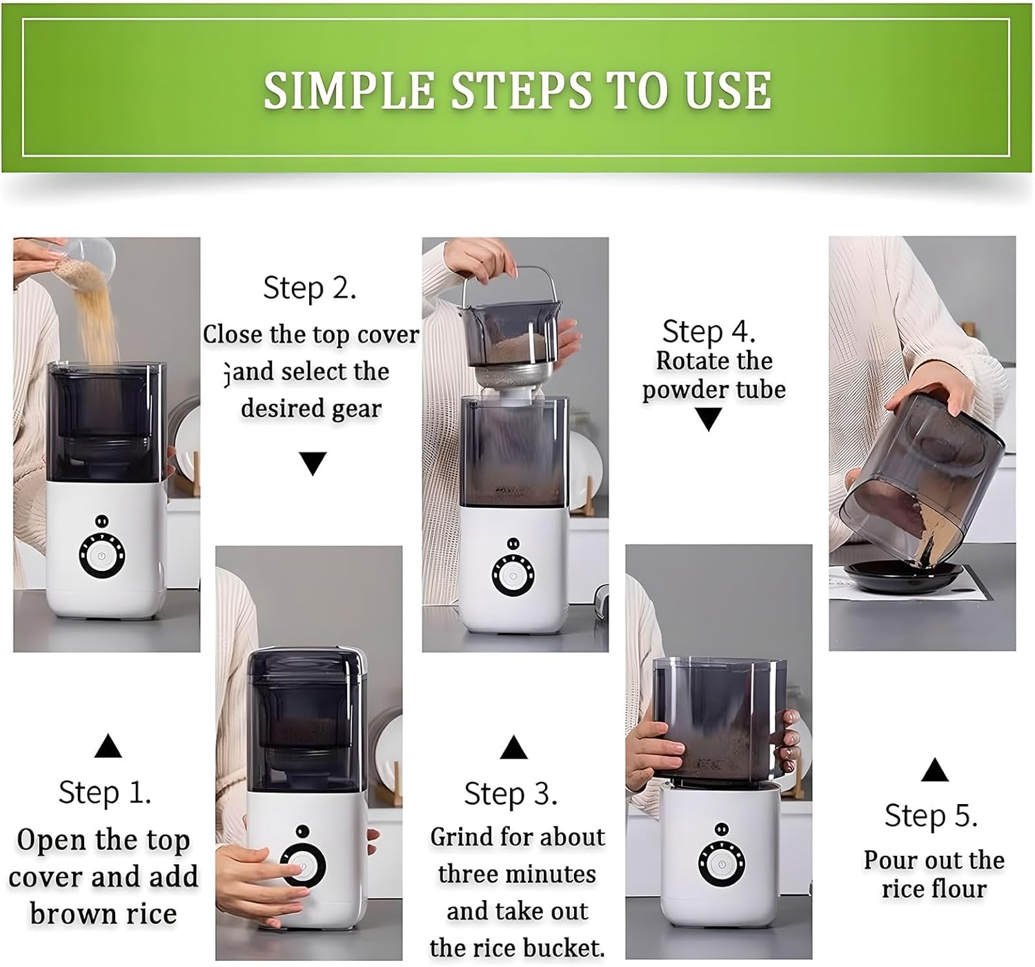 This household rice grinder not only improves processing efficiency, but also has an intelligent timing function, which allows you to set the time as needed, freeing your hands and saving time and effort. Easily adjust different rice grinding precisions to ensure that every grain of rice can achieve the best taste.Specification:Name: Household Rice GrinderColor: whiteRated power: 300WRated voltage: 220V/50HZRated capacity: 3 cups (approximately 480ml)Gear: 7 gears adjustmentNoise decibel: 80dBProduct gross weight: 3.4kgBare metal size:145×163×340mmPackage:1 * Host1 * Powder barrel1 * Rice bucket1 * Cup lid1 * Measuring cup