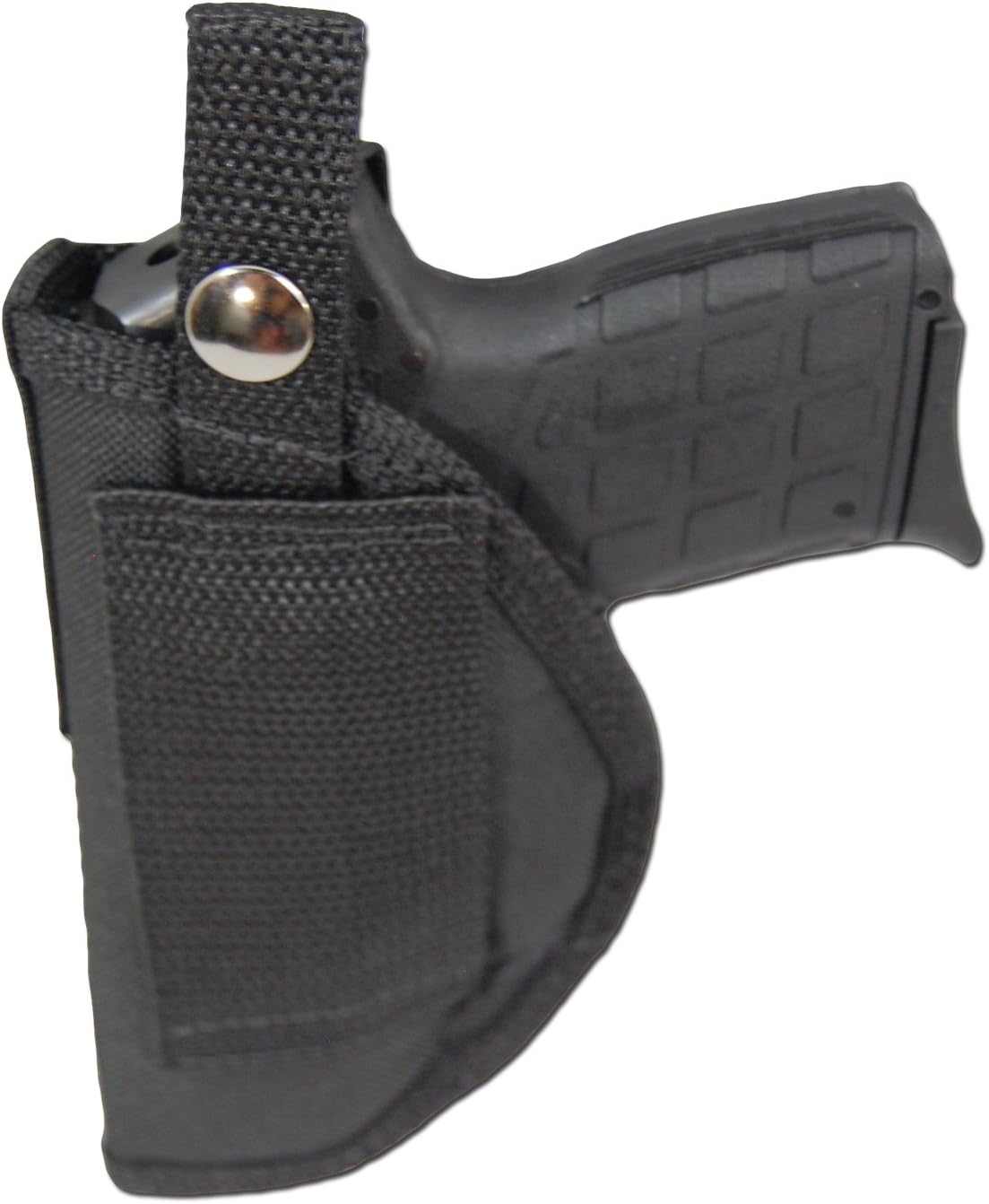 Outside the Waistband Carry Belt LOOP Holster makes a steady platform for drawing and re-holstering gun; belt loop allows wear on trouser belt or holster belt up to 2.5" wide. Constructed from laminate Cordura nylon, waterproof closed-cell foam padding and smooth nylon lining. Adjustable thumb-break retention strap protected by Strap Trap that covers Velcro adjustment. The photo shows a RIGHT-HAND DRAW.