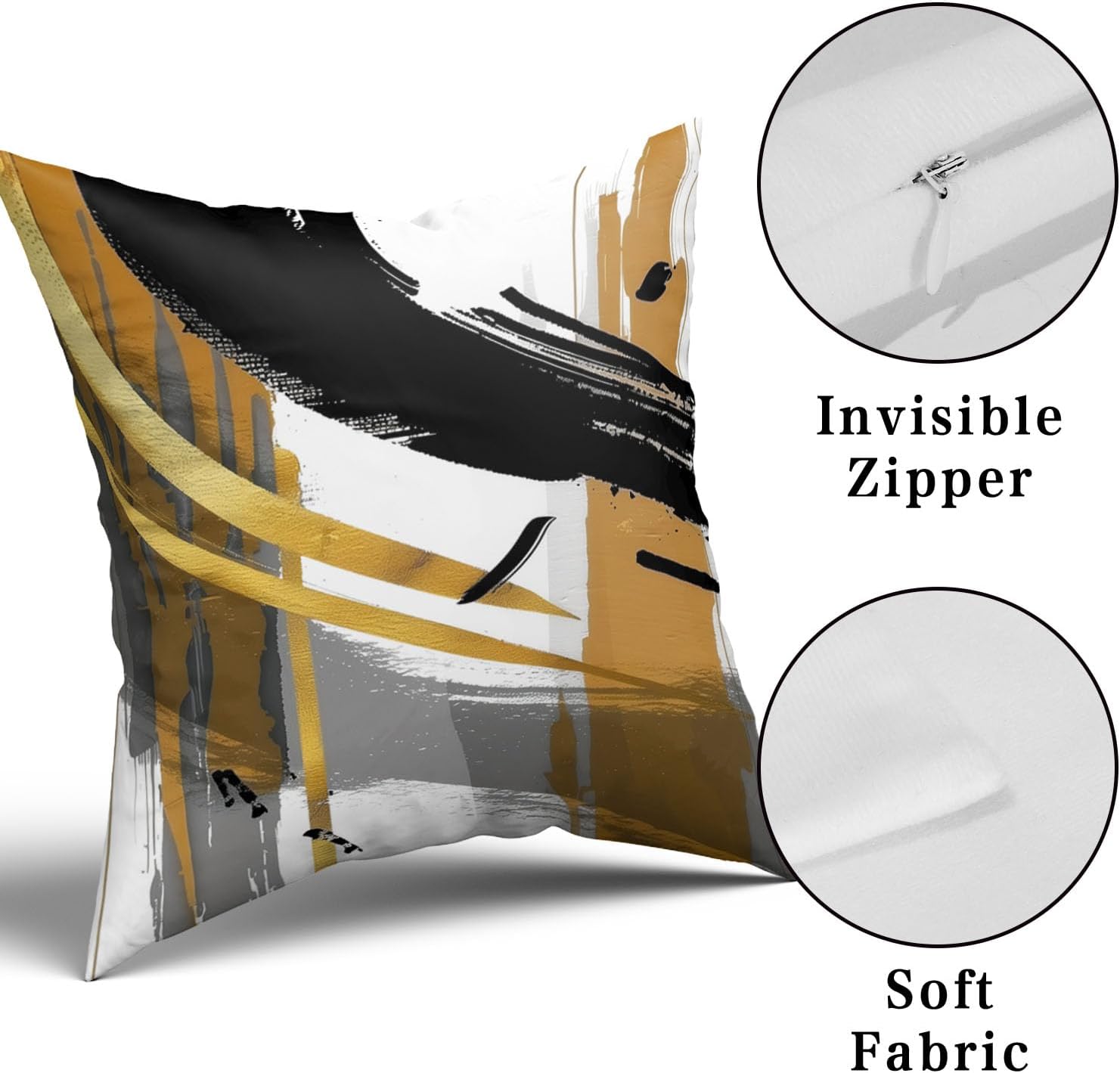 Black and Gold Pillow Covers 20x20 Abstract Throw Pillows for Couch Modern Striped Cushion Covers Black White and Gold Living Room Decor Sofa Bed Decorative Pillows Cases Set of 41.Made of durable and soft cotton blend.2.20 x 20 Inches(50 x 50 cm), Please allow 1-2cm deviation due to manual cutting and measurement.3.Invisible zipper design, appears well constructed.4.Vibrant colors is easy to match bed, couch, sofa, car, or chair.5.Nice holiday gift to your family & friends, bringing luxury look to your home decorative, living room, kitchen, bedding, chair, car, patio, bedroom, office, EtcWarm Tips1.The pattern is double sided print for easy home decor2.Due to the lighting and monitors, there are slight difference between the picture and the real item.Rest Assured PurchaseYou are our valued customer, if you have any question about the black white and gold striped pillow covers, please feel free to contact us.We aim to provide you with nice home decor and unsurpassed service.Package4 Pack of Black and Gold Pillow Covers(Inserts are not included.)