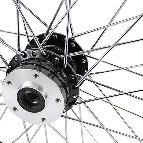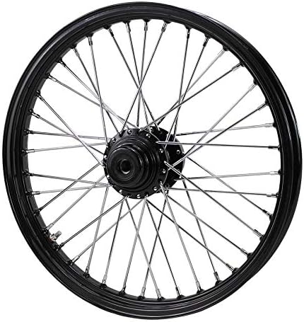 Moto Iron™ Complete Black Front 40 Spoke Wheel 21 "x 2.15" (fits Harley FXST Softail, FXDWG Dyna Wideglide, 1984-1999.) Billet Hub.Unique Features:Manufactured to exceed OEM specs.Precision CNC Machined billet aluminum hub. Much stronger than 3 piece welded hubs.Hub is 6.5" wide and has holes for 5/16" brake mounting hardware(see #116-0061).Single front brake rotor setup.Black Powdercoated Hub and Rim.Triple chrome plated spokes.Pre-Laced, trued, and ready to bolt on.3/4" ID timken style tapered roller bearings for long life.Bearings are standard Harley (Timken) style for easy replacement if ever required.Sealed spokes design for tube or tubless type tires. No rim strip required.Chrome valve stem included.Fitment Notes:Designed to fit Harley FXST Softail, FXDWG Dyna Wideglide, 1984-1999.Single flange design for single brake rotors.Direct fit to standard Moto Iron Springers (not wishbone springer unless wide glide spacer kit #115-0067 purchased seperatly)Note: If installing this wheel on a standard Moto Iron or similar brand springer front end, you must also purchase Part #115-0027 wheel spacer to complete the installation. This spacer is to be installed on the flange side of the wheel. This spacer is not necessary if installing on OEM 1984 FXST or FXDWG (Wide Glide) front ends.