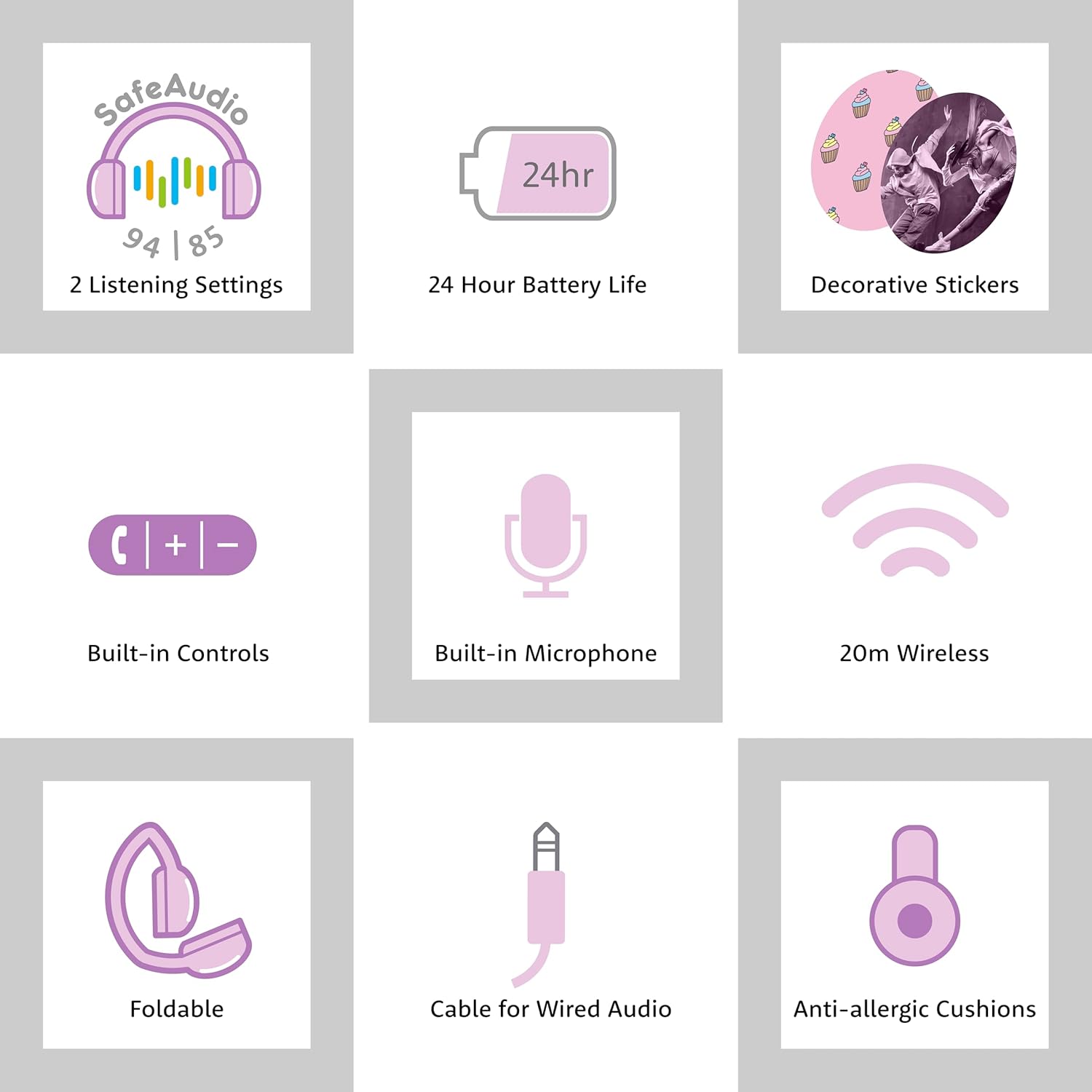 | Additional Features | SafeAudio 85-94dB 24-Hour Battery Life, Built-in Microphone, Call/Playback Controls, 20m Wireless Range |