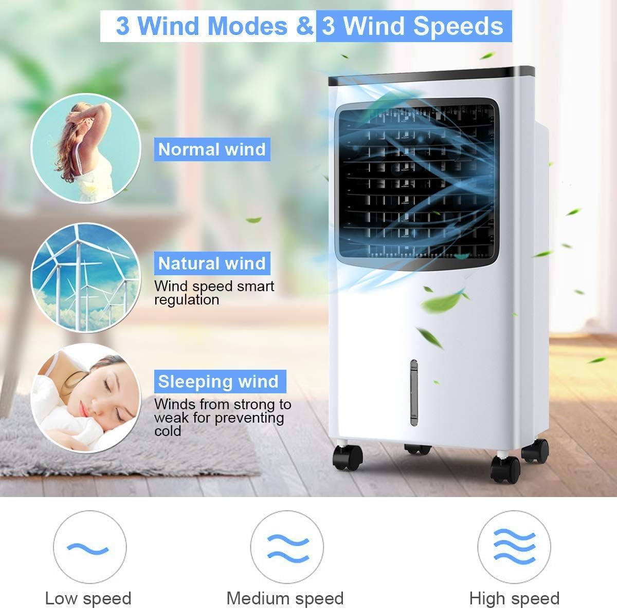 DescriptionBeat the summer heat with our top-notch portable air cooler. This multifunctional evaporative cooler doubles as a fan and humidifier for maximum versatility. Adjust the airflow to your liking with 3 wind speeds and modes. The automatic swing function ensures consistent and efficient cooling throughout your space. An intuitive control panel and a comprehensive remote control make operating this air cooler a breeze. Plus, with a 7.5-hour timer, you can set it and forget it for a restful night's sleep.FeaturesFunctions as an air cooler, fan, or humidifier7.5-hour timer for convenient automatic shut-off8L water tank for extended coolingSmooth rolling casters for easy mobilityCustomize airflow with 3 wind speeds and modesAutomatic swing function for even coolingConvenient remote control for easy operationEnergy-efficient with high cooling efficiencyIncludes 2 ice crystal boxes for enhanced coolingSafe bladeless design suitable for homes with childrenCompact size ideal for home and office useSpecification Color: Black + White Net Weight: 14 lbs Overall Dimension: 15’’(L) x 11’’(W) x 29’’(H) Power: 75W Voltage: 110V, 60Hz Water Tank Capacity: 8L Fan Speed: Low/Middle/High Package includes:1 X Air Cooler1 X Remote Control2 X Ice Crystal Boxes1 X Instruction Manual
