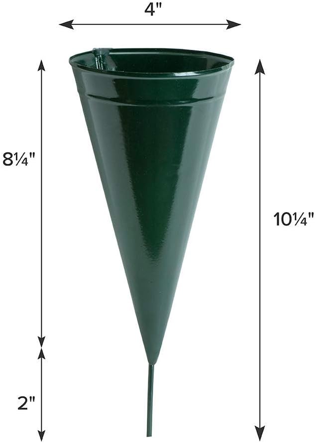 Honor your loved one’s gravesite by adding a bouquet of live or artificial flowers to these cone-shaped, green metal cemetery vases. For easy placement, each vase comes with a built-in stake. The stake allows the vases to securely stay upright in the desired location throughout each season.