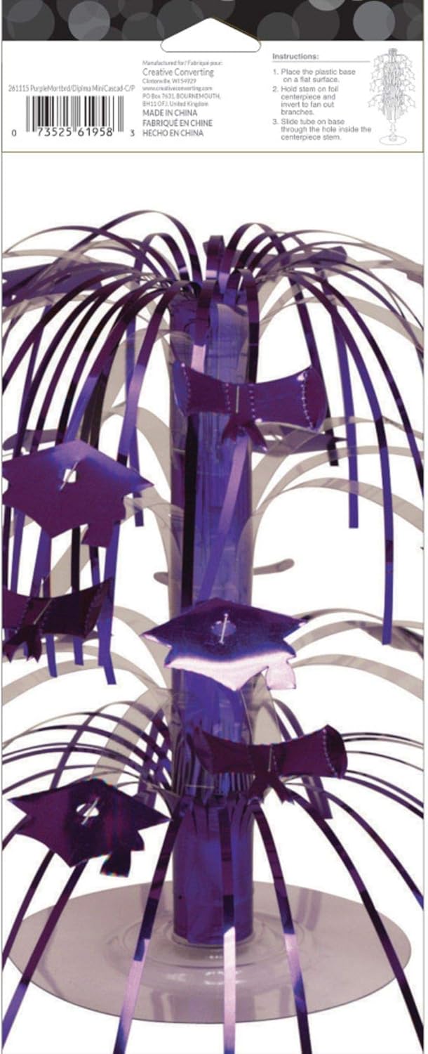 The products in the Wholesale Department are offered in Case ONLY. The Case ONLY price is at a BIG bulk discount. Purple Grad Mini Cascade Centerpiece CASE (12 Decorations) Each package contains 1 decoration Graduation centerpiec colored in purple to match the school colors. 12 packs of 1 centerpiece Measures 8.5in Item 261115